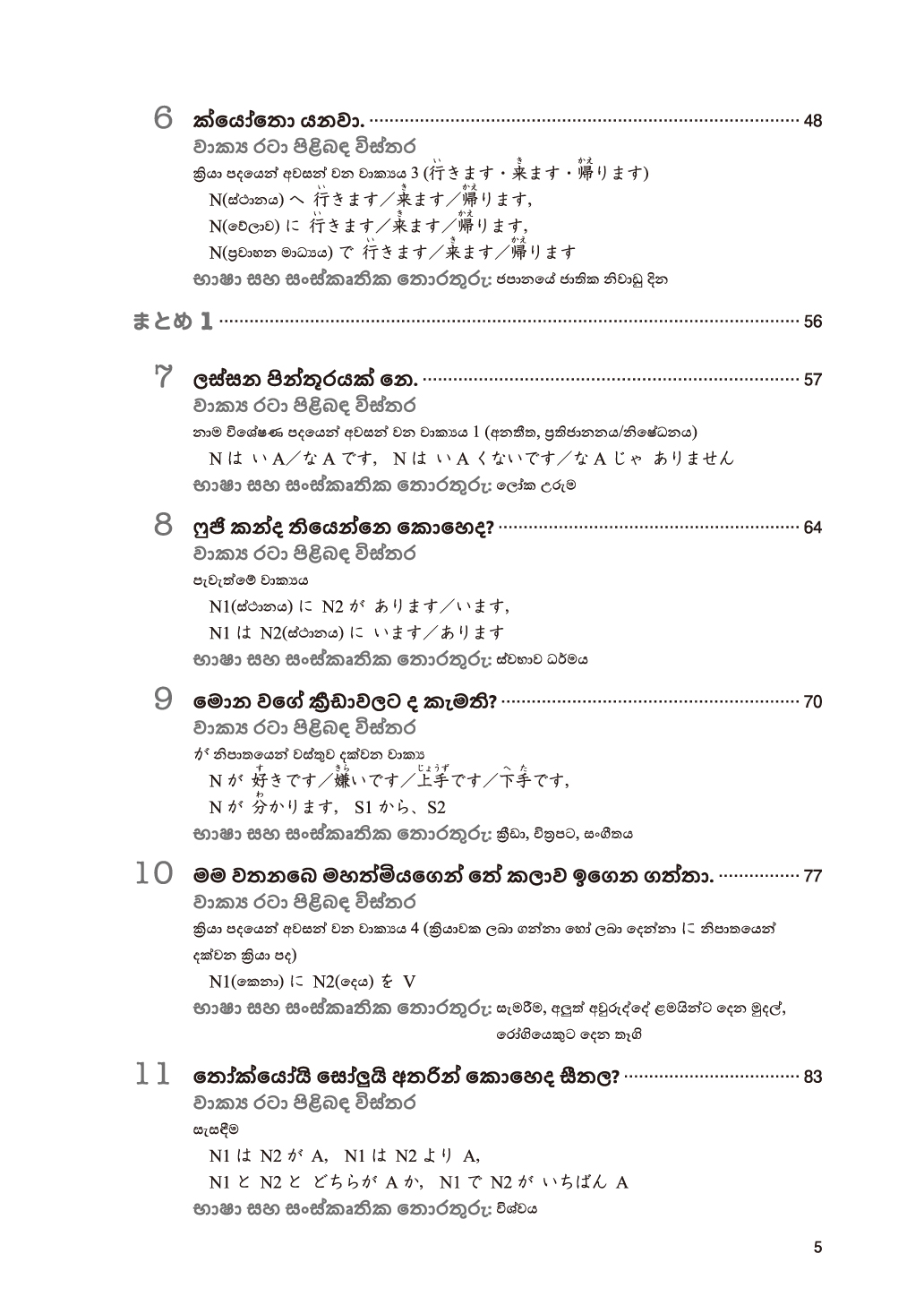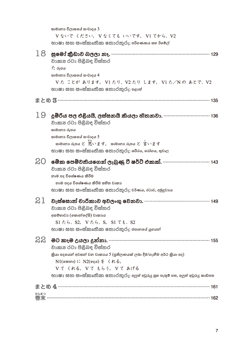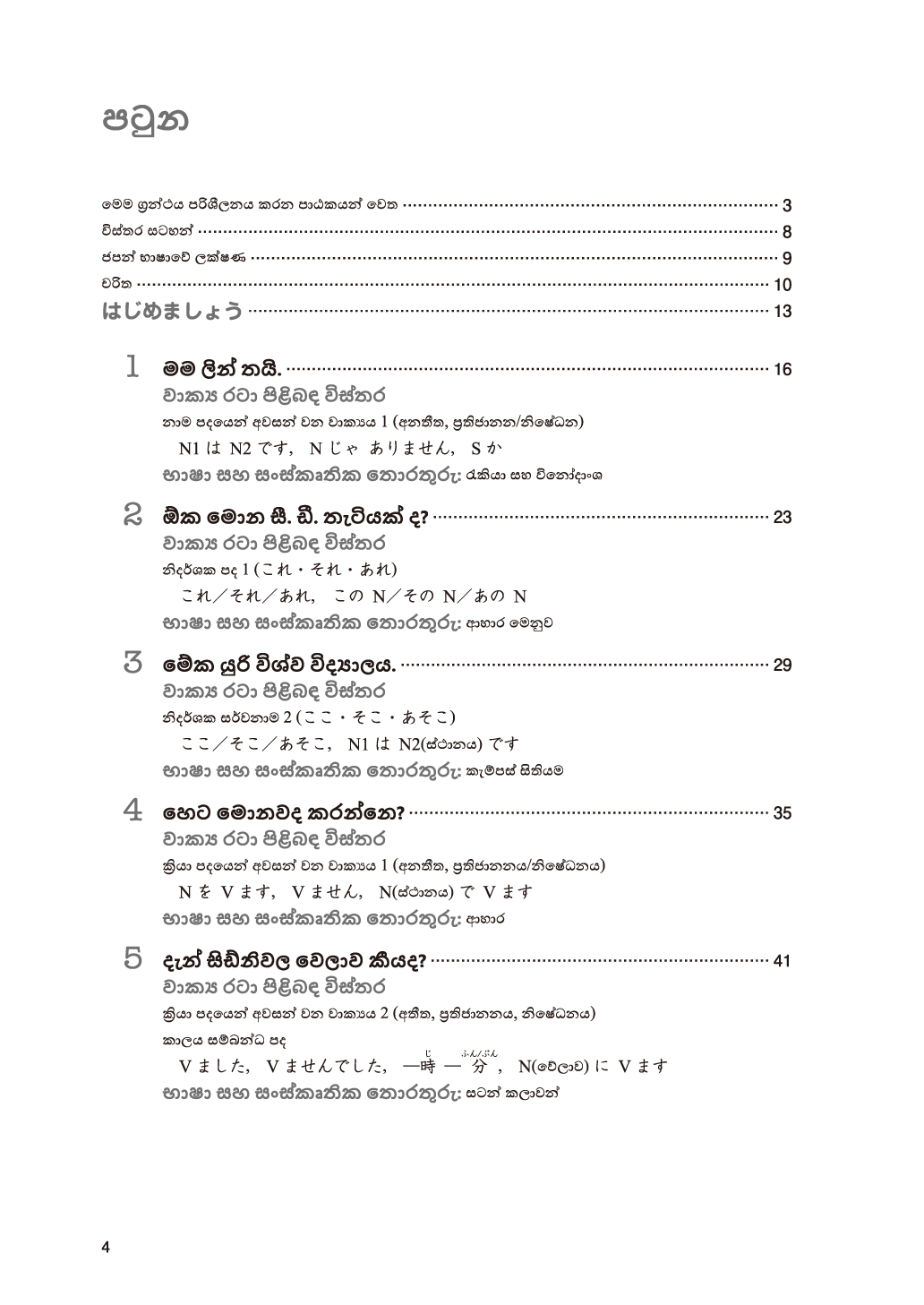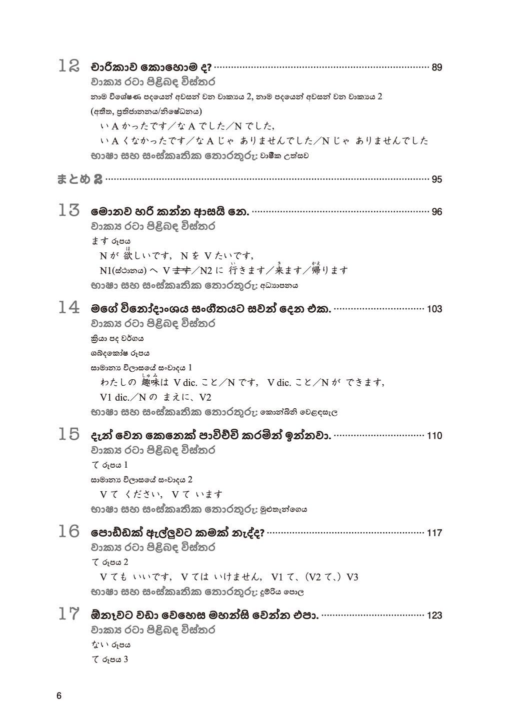 各課の本文会話と新出語彙のシンハラ語訳、学習項目の説明(シンハラ語)が掲載されています。また、知っていると便利な語彙も紹介しています。