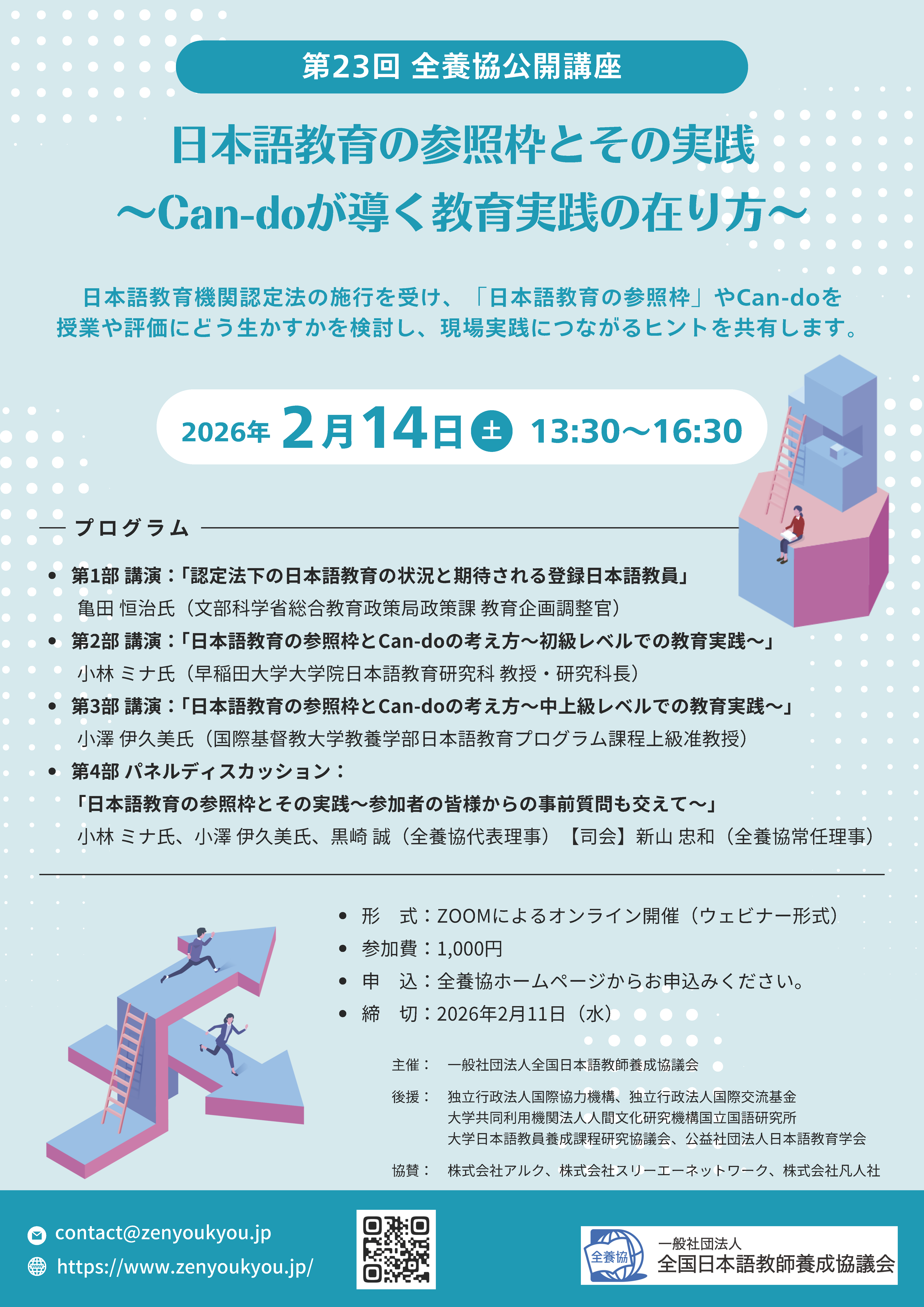 2026年2月14日(土)第23回全養協公開講座「日本語教育の参照枠とその実践~Can-doが導く教育実践の在り方~」